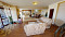 Дом на первом этаже состоит из: просторной гостиной с кухней, плитой, холодильником, микроволновой печью, диваном с двумя спальнями, тремя столами и несколькими стульями, часами на стене, телевизором, интернетом, телефоном, холодильником, шкафом для одежды, стиральной машиной, бойлер, туалет.