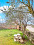 Участок площадью 1500 кв.м разделен на две части, одна часть - фруктовый сад, а другая - хозяйственные постройки.