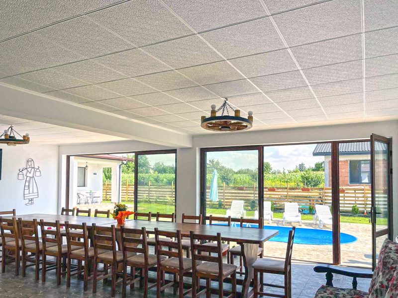 Потолки утеплены плитами, а в банкетном зале – ламинатом.